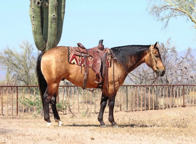 As handy as a Leatherman tool, Danny is as versatile and well rounded as any gelding around. Anything you want to do horseback, this guy is game. He is such an incredibly special gelding to us and to everyone that has been part of his life. Danny’s sweet and kind disposition will steal your heart everyday. He is as honest as the day is long and such a willing, kind and gentle individual. He has a proven record and will be the funnest partner to go enjoy in the show pen and bring home the money and prizes! Danny is very solid and easy in all his reining maneuvers with fancy spins, deep stops and an automatic lead change. He is calm, cool and collected. He is a pretty mover and will stand out in the Ranch Riding classes as well. Danny is great to go cut on in the arena or in the sorting pens. He is a natural at reading cows and has the grit to hold a tough one from the herd. Point, drop your hand and enjoy the ride. He’s all business and knows his job. Danny is a deluxe ranch horse and will be the gelding you want to saddle if you need to get a job done on the ranch. He has earned his keep and knows what long days are and all about a wet saddle pad. He has been used in big country to gather cattle and spent a few winters working the wheat pasture cattle, doctoring, branding and gathering. Back him in the box or go chase one down in the pasture, Danny is super to rope on. Leaves the box flat and smooth, perfect rate and timing, sweet move in the corner and can face on the head side. He will suit any level of roper. You can practice on him all day long and he gives you the same shot every time. You can rope and tie one down in the pasture and he will hold strong from the horn. Danny has been ridden by the kiddos and he’s the type of horse you can walk off and trust. He’s always gentle and safe. If your safety is a priority, he will give you the confidence you need. He will ride for anyone that can climb up in his saddle. Danny is great on the trails and will go right where you point him. He is good with heavy traffic, crazy dogs, blowing tarps, loud gunfire, and wild animals. Very sure footed and smooth to ride. This gorgeous buckskin gelding will be enjoyable to own everyday. He is extremely easy to handle on the ground, will meet you at the gate to catch, and saddles up gentle every time even without routine riding. It doesn’t matter if you just want to ride to the mailbox and back, Danny is the one you will want to ride. Check out this special gelding, they don’t come along like him everyday.