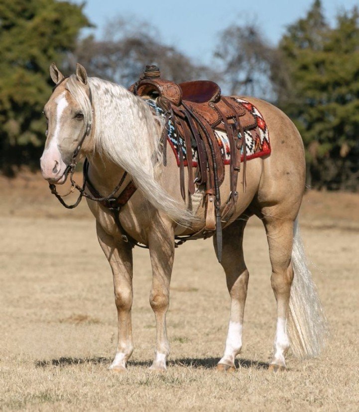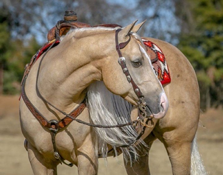 Montana is the true “Barbie Doll” of horses. He is absolutely astonishing with flawless conformation, gorgeous golden color and a Snow White mane and tail that go on forever. He’s a dream to ride, so smooth and push button. He can easily plus all maneuvers with a ton of talent and athletic ability. His fancy looks and showy style will definitely get you noticed in the show pen along with anywhere you take him. Montana has a lot of natural cow with great rate and cow sense. He’s making a fancy switch ender rope horse. Great in the box, leaves flat, runs hard, stylish move in the corner and has a snappy face.